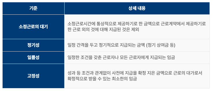 근로자의 근무 시간, 실적 등의 조건과 관계없이 지급되어야 합니다. 즉, 근로 시간이나 실적에 영향을 받지 않는 고정적인 금액이어야 합니다.