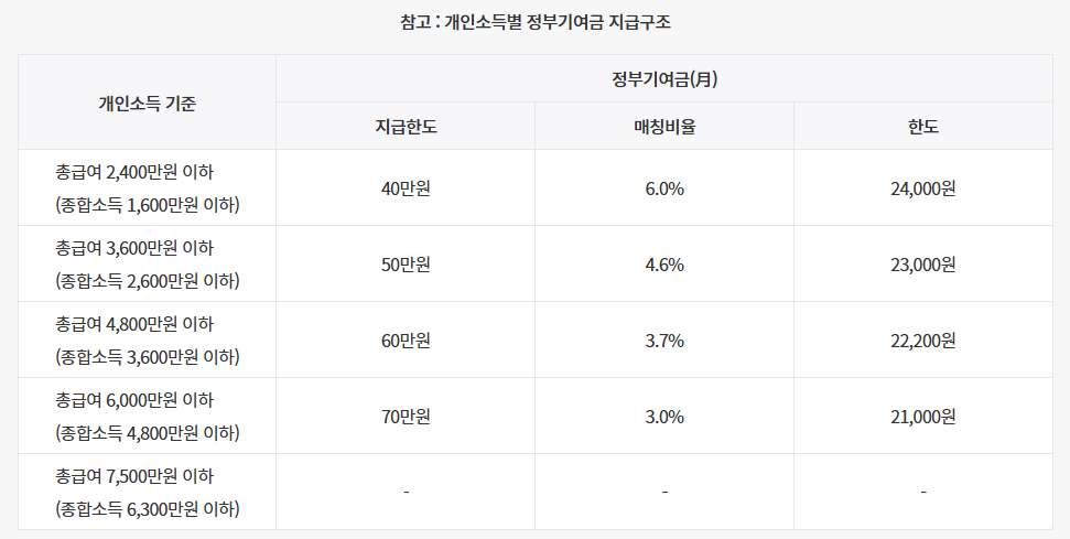 정부 기여금 | 월 최대 2만4000원 (5년간 144만 원) | 월 최대 3만3000원 (5년간 198만 원) |